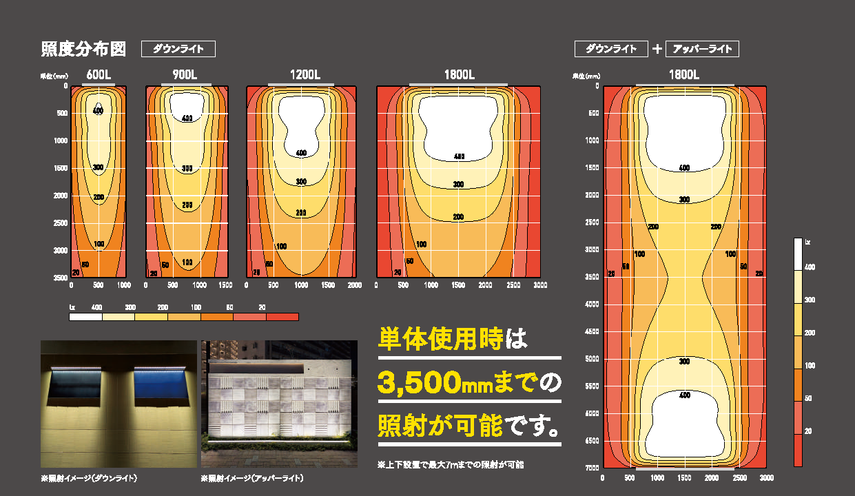 外照式LED照明。全規格 D233mm の短い出幅のため様々な敷地条件にも設置可能。 より遠く、広く、均一に。最適な配光設計によりフラットな照射を実現。